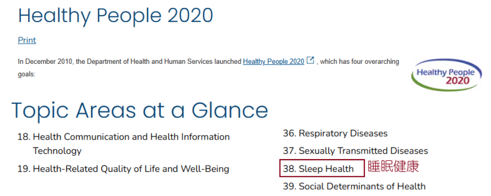 在2020年,睡眠健康被納入為美國衛(wèi)生與公共服務(wù)部所頒布《Healthy People 2020》的42個主題之一,用于指導(dǎo)全民健康和疾病預(yù)防實踐,以改善美國國民健康的10年目標(biāo)規(guī)劃。