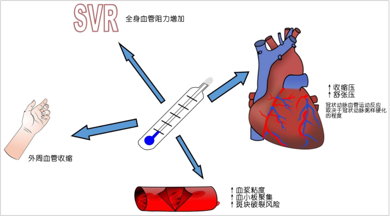 脂代謝異常、氧化應激和炎癥反應亢進被認為是動脈粥樣硬化發(fā)展的核心因素,已有大量研究證明寒冷能影響機體脂代謝、激活氧化應激和引起免疫反應亢進,提示寒冷與動脈粥樣硬化發(fā)展高度相關(guān)。且相關(guān)研究顯示與長期嚴寒的地區(qū)相比,溫暖地區(qū)的冷暴露會導致更高的心肌梗死風險。這表明急性冷暴露可能是心肌梗死發(fā)生的重要危險因素。