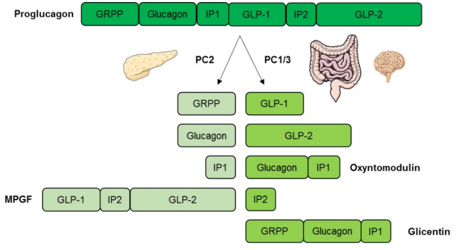 胰高血糖素(Glucagon)是一種主要由胰腺α細(xì)胞分泌、含有29個(gè)氨基酸的肽類激素,分子量約3.5kD,在血清中的濃度約為2~20pmol/L,主要在肝內(nèi)降解,部分在腎內(nèi)降解。胰高血糖素由胰高血糖素原(Proglucagon)衍生而來,后者可被加工成多種相關(guān)的肽類激素。胰高血糖素原在胰島α細(xì)胞、腸道內(nèi)分泌的L細(xì)胞中都有表達(dá),在腦干和下丘腦的神經(jīng)元中也有少量表達(dá)。胰高血糖素原分別由激素原轉(zhuǎn)化酶1/3(PC1/3)和激素原轉(zhuǎn)化酶2(PC2)處理。在胰腺中,PC2將胰高血糖素原加工成胰高血糖素,而在腸道和大腦中,胰高血糖素原由PC1加工,形成胰高血糖素樣肽1(GLP-1)和胰高血糖素樣肽2(GLP-2)。