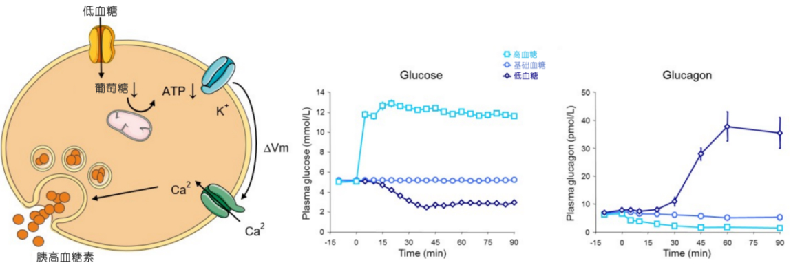 腸道激素---葡萄糖依賴性促胰島素肽(GIP)會(huì)刺激胰高血糖素的分泌,而GLP-1則會(huì)抑制胰高血糖素的釋放;體生長(zhǎng)抑素、胰島素則可通過旁分泌抑制其分泌。除此之外,胰高血糖素還可通過刺激β細(xì)胞分泌胰島素來間接調(diào)節(jié)自身分泌。