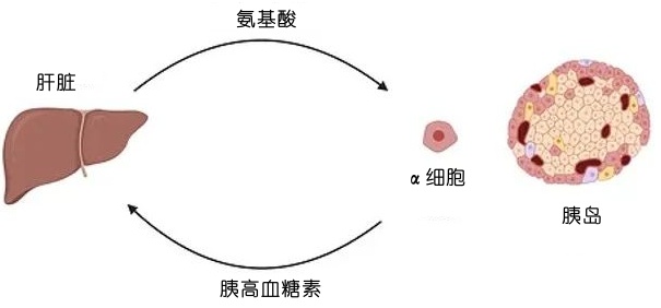 在長(zhǎng)期禁食期間,胰高血糖素會(huì)通過上調(diào)參與氨基酸葡萄糖生成過程的酶,刺激該過程(通過葡萄糖生成)形成葡萄糖。胰高血糖素可促進(jìn)氨(脫氨基過程中產(chǎn)生的有毒副產(chǎn)物)轉(zhuǎn)化為尿素,并隨尿液排出體外。因此,胰高血糖素可降低血液中的氨含量。抑制胰高血糖素受體會(huì)破壞胰高血糖素的作用,導(dǎo)致血漿中氨基酸水平升高和胰腺α細(xì)胞增生,進(jìn)而導(dǎo)致胰高血糖素分泌過多。這表明,胰高血糖素和氨基酸在肝臟和胰腺α細(xì)胞之間的反饋回路中存在聯(lián)系。