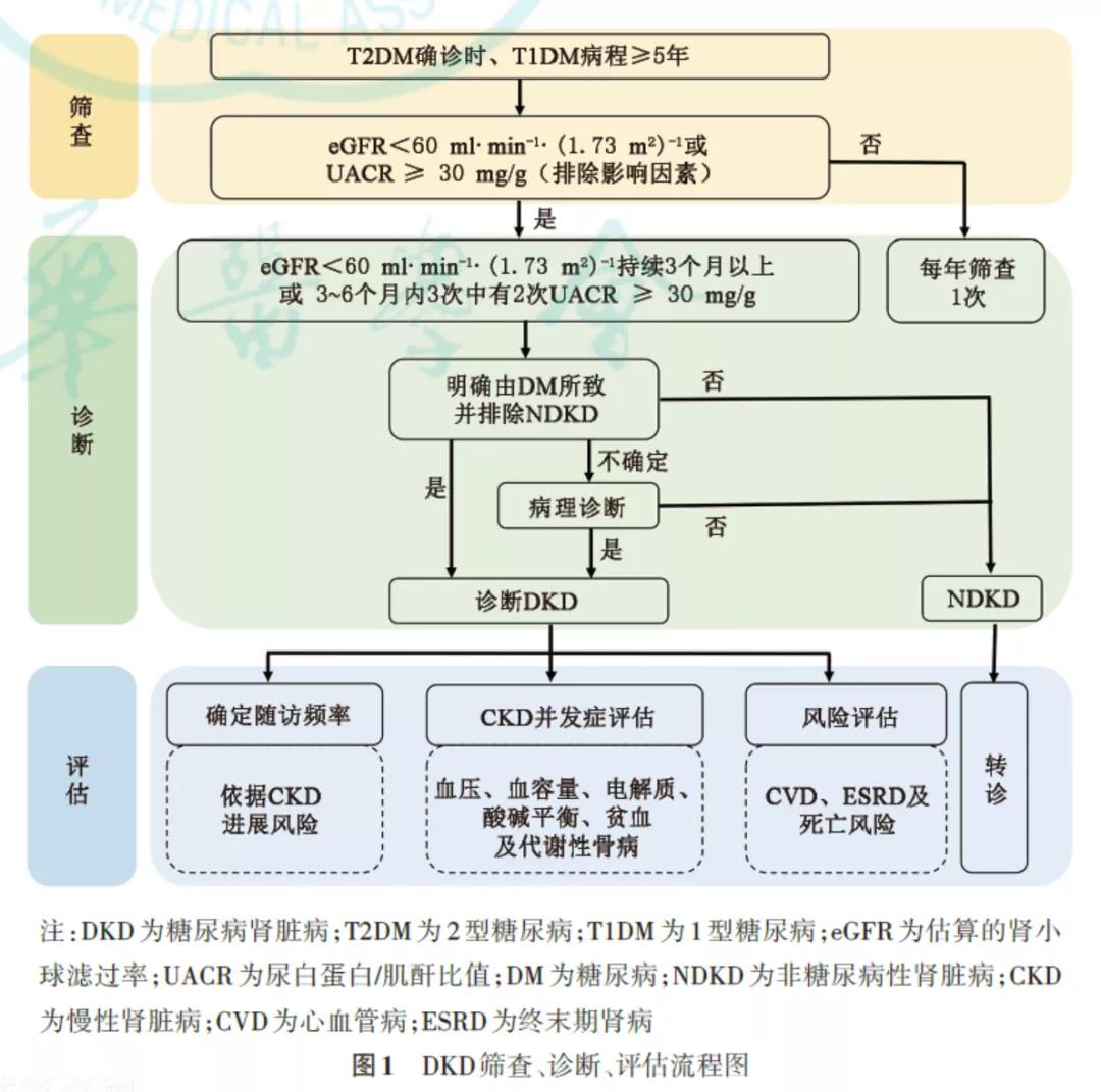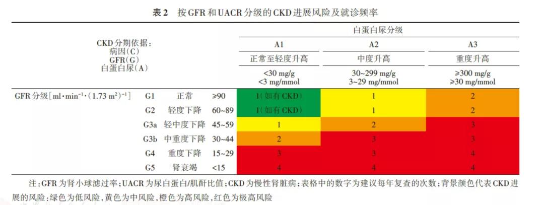 在確診DKD后,應(yīng)根據(jù)GFR及尿白蛋白水平進一步判斷CKD分期,同時評估DKD進展風(fēng)險及明確復(fù)查頻率。
