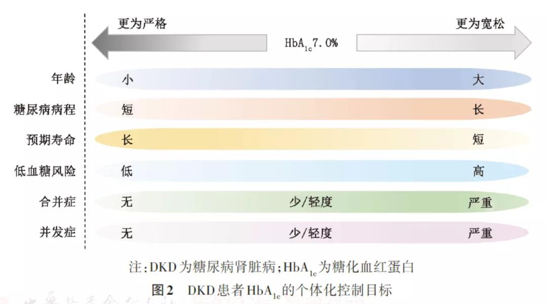 HbA1c<6%或>9%均會增加心血管及死亡風(fēng)險,而強化降糖的腎臟保護作用需要較長時間(2~10年)才能出現(xiàn)。因此,在制定DKD患者的血糖控制目標(biāo)時,應(yīng)根據(jù)年齡、糖尿病病程、預(yù)期壽命、合并癥、并發(fā)癥、低血糖風(fēng)險等,制定個體化控制目標(biāo)。