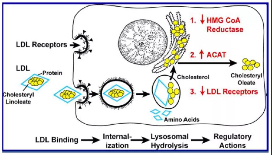 低密度脂蛋白受體存在于肝臟和大多數(shù)其他組織中,它識(shí)別 Apo B-100 和 Apo E,通過(guò)內(nèi)吞作用介導(dǎo)攝取LDL、乳糜微粒殘余物等,脂蛋白顆粒在溶酶體中降解并釋放膽固醇[2]