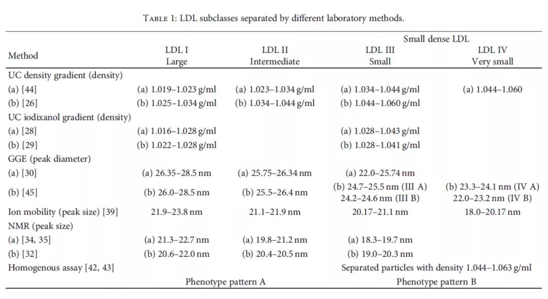 已知低密度脂蛋白的密度為 1.019~1.063 g/mL。在大多數(shù)研究中,利用超速離心手段對(duì)LDL顆粒分為3個(gè)亞類(lèi),LDL I、II 和 III 的密度分別為 1.025–1.034 g/mL、1.034–1.044 g/mL和 1.044–1.060 g/mL;利用梯度凝膠電泳 (GGE)手段對(duì)LDL顆粒分為 4個(gè)亞類(lèi),LDL I(26.0-28.5 nm)、LDL II(25.5-26.4 nm)、LDL III(small LDL ,24.2-25.5 nm)和 LDL IV(very small LDL ,22.0-24.1 nm); 核磁共振 (NMR) 可用于研究血漿中的脂蛋白類(lèi)別,小密度低密度脂蛋白(Small Dense Low-Density Lipoprotein,sdLDL)通過(guò) NMR 測(cè)定為粒徑為 18.0~20.5nm顆粒[3]