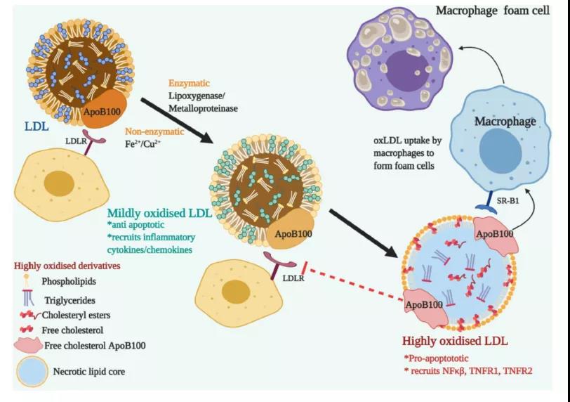 氧化低密度脂蛋白(ox-LDL)是低密度脂蛋白被完全氧化后,誘導(dǎo)巨噬細(xì)胞內(nèi)的膽固醇積聚和泡沫細(xì)胞形成的元兇,是動(dòng)脈粥樣硬化的重要危險(xiǎn)因素[5]。