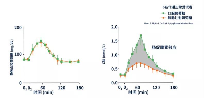 1986年科研人員通過實驗:在增加 25、50 和 100 g 口服葡萄糖負荷和相應等糖的葡萄糖輸注后,在代謝正常的受試者中測量靜脈C肽值計算出綜合胰島素分泌量;在血糖水平和變化趨勢基本一致的情況,胰島β細胞分泌反應的差異歸因于腸促胰素效應。胰島素和C肽濃度都隨著口服葡萄糖負荷的增加而增加,腸促胰素效應約占正常成人餐后總胰島素水平的70%左右[2]。
