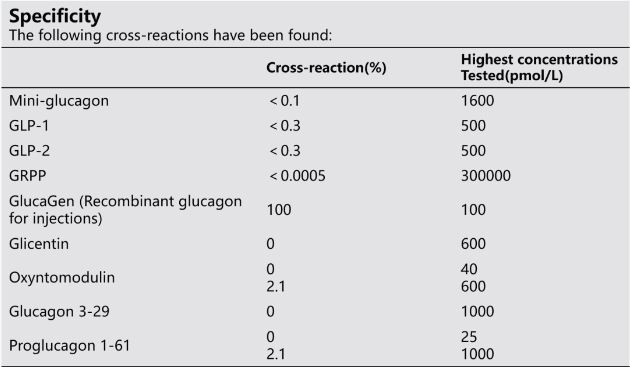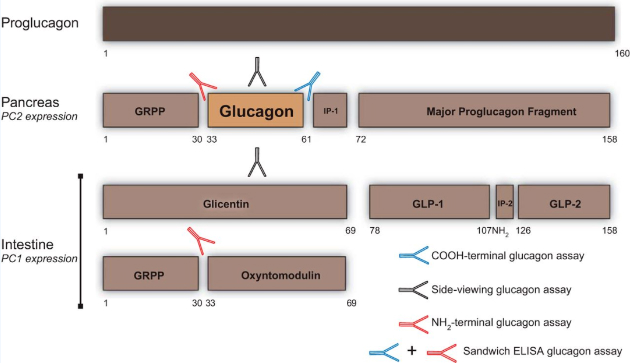 檢測(cè)試劑開(kāi)發(fā)時(shí),N端抗體會(huì)與胃泌酸調(diào)節(jié)素(oxyntomodulin)發(fā)生交叉反應(yīng),而 C 端抗體則會(huì)與胰高血糖素原1-61發(fā)生交叉反應(yīng),針對(duì)胰高血糖素中間片段開(kāi)發(fā)的抗體則有可能與上述所有肽結(jié)合【11】。胰高血糖素的測(cè)定需要針對(duì)兩個(gè)末端的雙抗體夾心技術(shù),抗體特異性要求高。