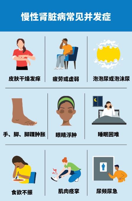 早期慢性腎臟病通常沒(méi)有癥狀,但隨著時(shí)間的推移而惡化,常見(jiàn)癥狀包括尿量減少、由于組織液增多引起體重增加(水腫)、疲勞乏力、食欲不振或體重?zé)o故減輕等。