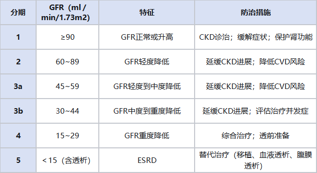 慢性腎臟病的分期目前普遍采用的是美國(guó)腎臟基金會(huì)制定的指南,按照腎臟病改善全球預(yù)后(KDIGO)指南的分期標(biāo)準(zhǔn),將慢性腎臟病根據(jù)eGFR分為1-5期。
