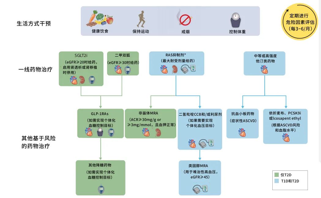 相關(guān)指南建議2型糖尿病和1型糖尿?。ú〕坛^(guò)5年)患者應(yīng)每年至少檢查尿常規(guī)、UACR和血肌酐(計(jì)算eGFR)一次。同時(shí)重視對(duì)糖尿病腎病危險(xiǎn)因素的干預(yù),包括高血糖、高血壓、肥胖(尤其是腹型肥胖),避免腎毒性藥物及食物、急性腎損傷、蛋白攝入過(guò)多。研究表明,良好的生活方式、有效的血糖和血壓控制是防治糖尿病腎病的關(guān)鍵。