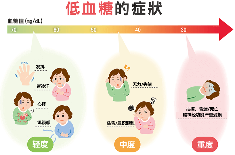如果說高血糖的危害是以年來計(jì)算的,那么低血糖的危害則是以小時來計(jì)算的。輕度低血糖可引起交感神經(jīng)興奮,出現(xiàn)饑餓感、頭昏眼花、心慌手顫、面色蒼白、出冷汗、虛弱無力等癥狀,而嚴(yán)重低血糖則可引起驚厥、昏迷甚至死亡。