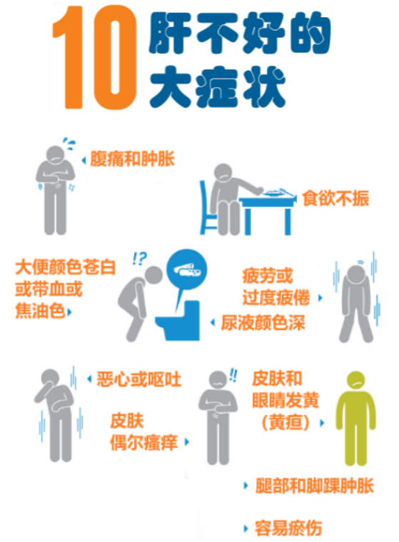 肝不好的癥狀表現(xiàn)主要包括乏力、厭油膩、消化不良、腹脹、肝區(qū)隱隱不適、面色晦暗、皮膚出現(xiàn)毛細(xì)血管擴(kuò)張、尿色變黃、精神較差、體重下降、營(yíng)養(yǎng)不良等。