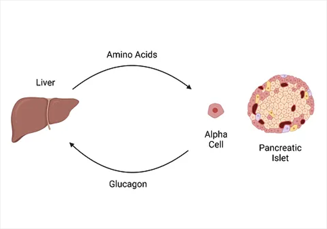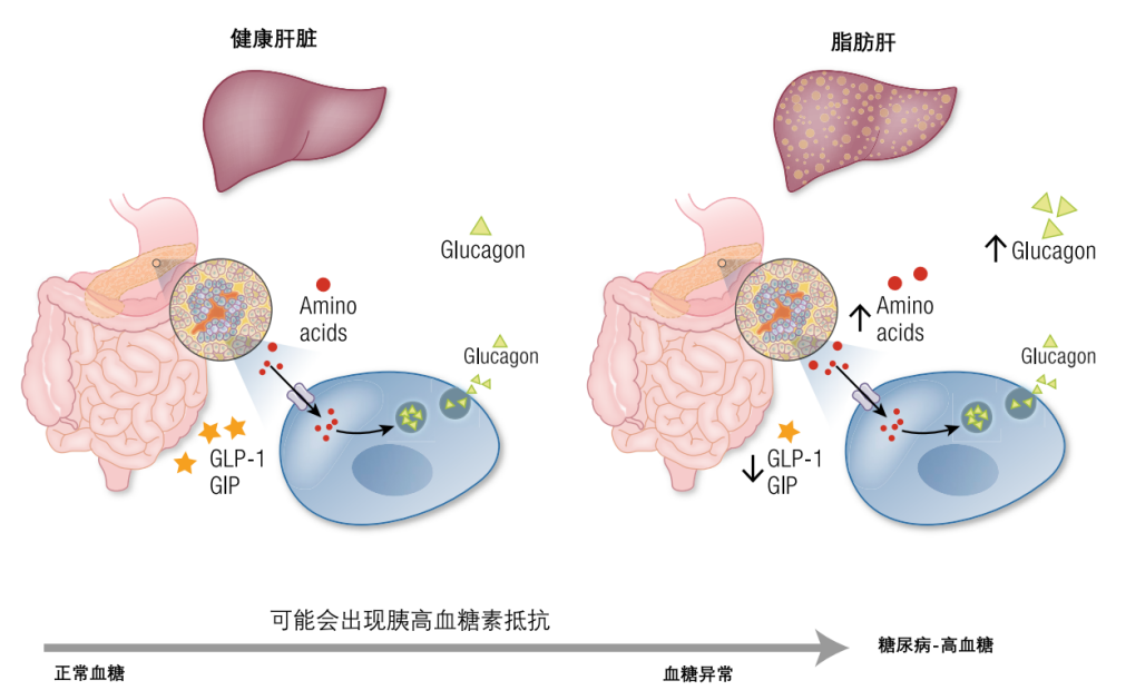 在代謝性疾病中,如2型糖尿病和/或代謝相關(guān)脂肪性肝病,肝臟脂肪變性會(huì)在肝臟脂質(zhì)和氨基酸代謝水平上升時(shí)導(dǎo)致對(duì)胰高血糖素的抵抗,胰高血糖素刺激的尿素生成減少,循環(huán)中的氨基酸水平會(huì)升高,這種高氨基酸血癥會(huì)導(dǎo)致高胰高血糖素血癥。